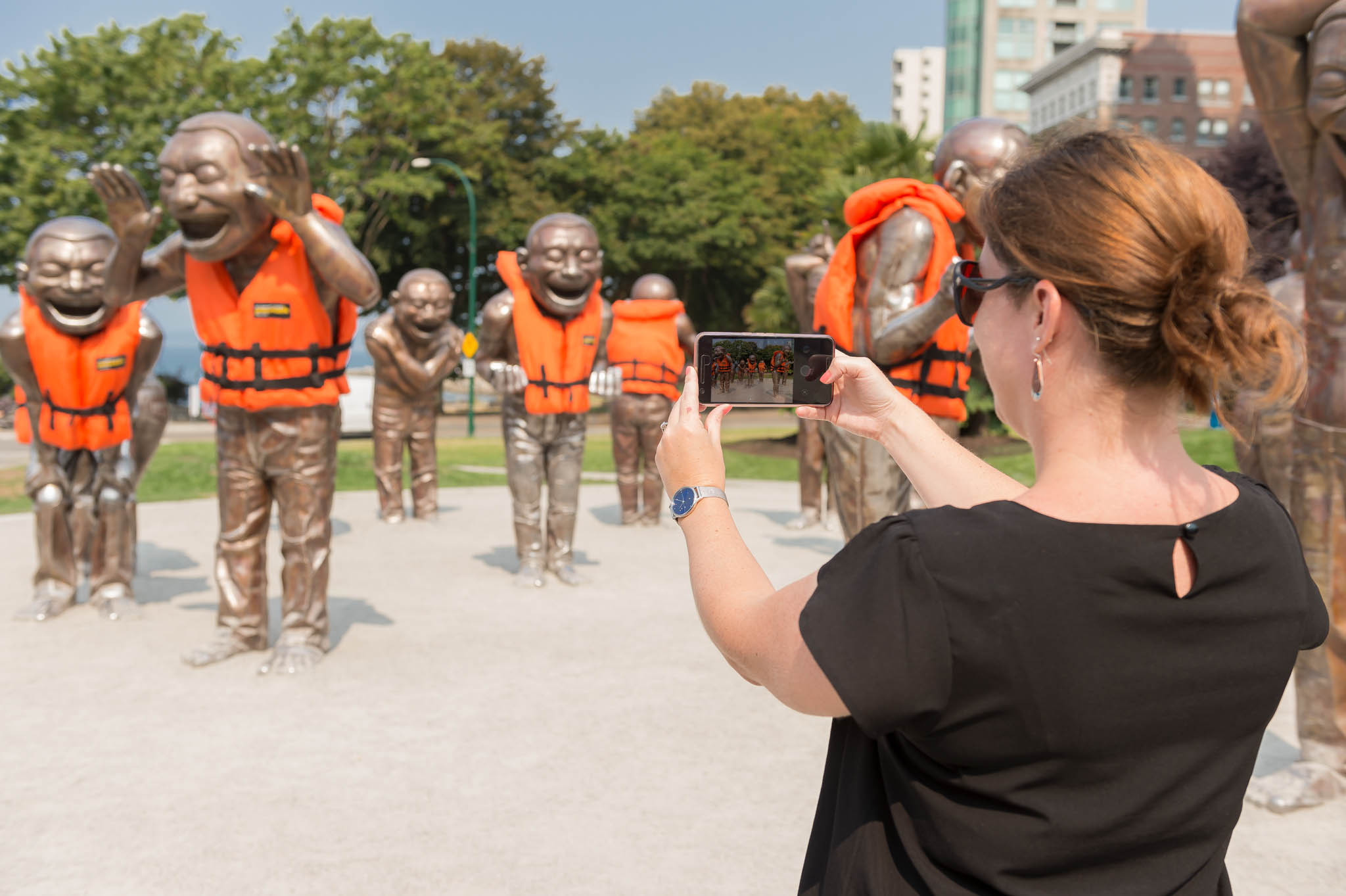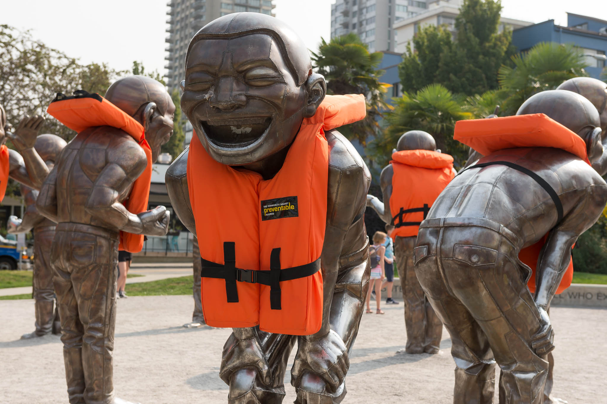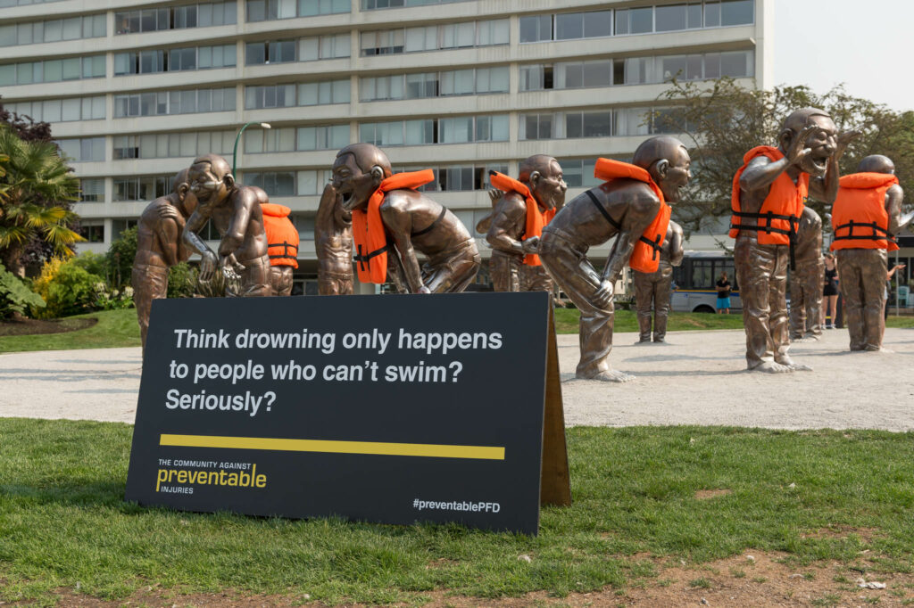 And that’s why, in Summer 2017, we partnered with the Canadian Red Cross and Vancouver Biennale once again to dress up the bronze figures of Vancouver’s beloved giant-sized sculpture “A-maze-ing Laughter” in oversized orange lifejackets. Our goal: to encourage people to think about staying safe before they make a splash.