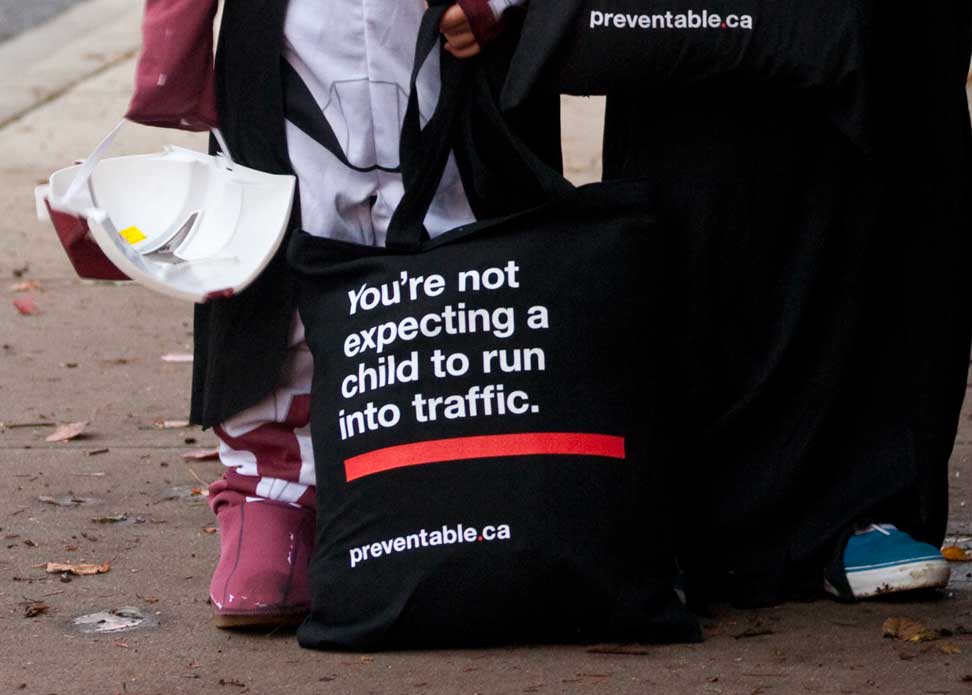 London Drugs staff wore t-shirts that read, You’re not expecting to seriously injure yourself today, and stores across BC sold reflective trick-or-treat candy collecting bags with the message: You’re not expecting a child to run into traffic.