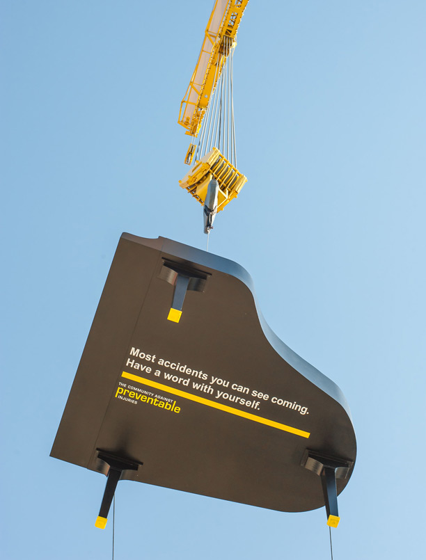 The focus of this campaign was to ask, “Are you as safe as you think?” We wanted to remind you that most “accidents” you can see coming. And we did this in a big way. We suspended a grand piano in midair and prompted people to look up. This visual spectacle reminded everyone that we can stop injuries before they happen.
